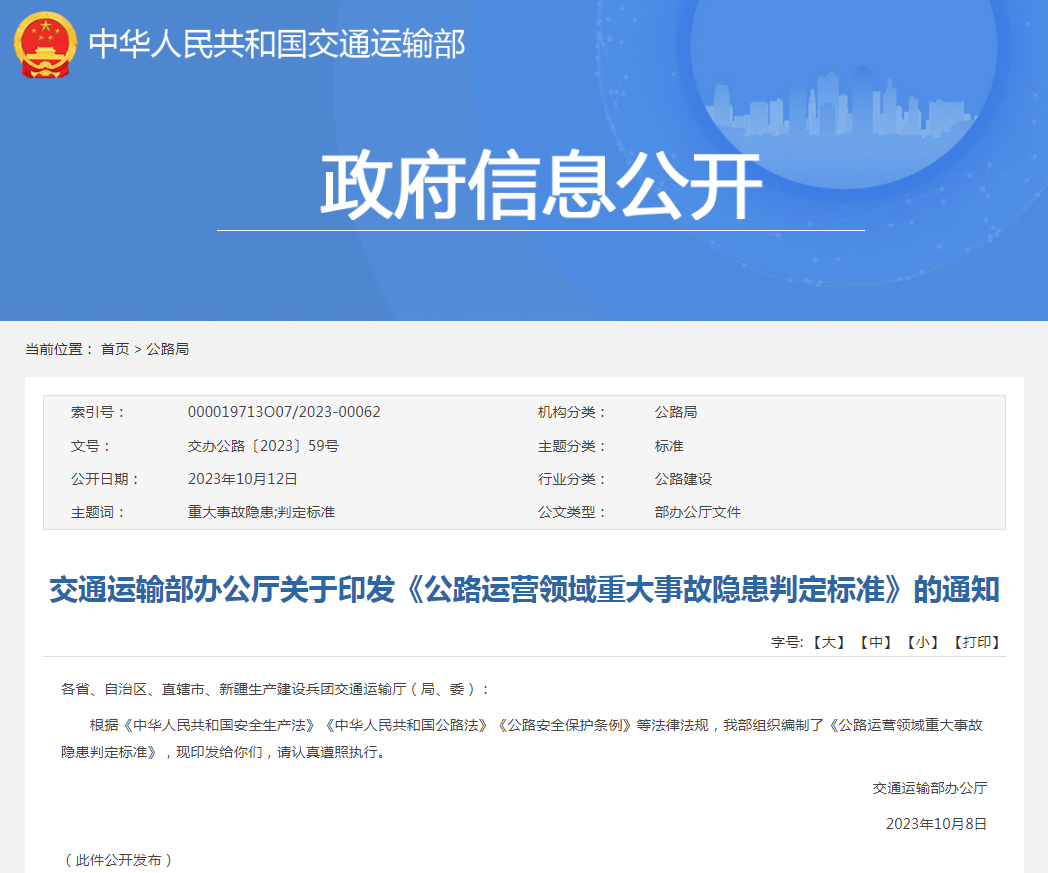 《公路运营领域重大事故隐患判定标准》