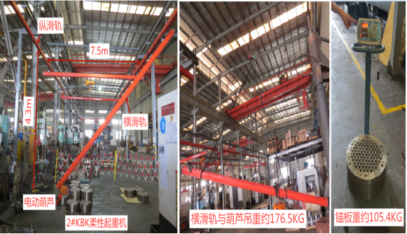 涉事起重机为鑫盛机械公司生产车间2#KBK柔性起重机,是鑫盛机械公司自行搭建安装,主要由纵滑轨、横滑轨、电动葫芦等组成。两条纵滑轨间距离约7.5m,横滑轨距离地面高约4.3m。横滑轨南端从纵滑轨脱落,连同电动葫芦一起掉落到地面,横滑轨北端仍挂在纵滑轨上。横滑轨与葫芦吊重约176.5KG、锚板重约105.4KG,两者合计约281.9KG。电动葫芦起重量为500KG,未超过KBK柔性起重机的荷载量。(见图2)